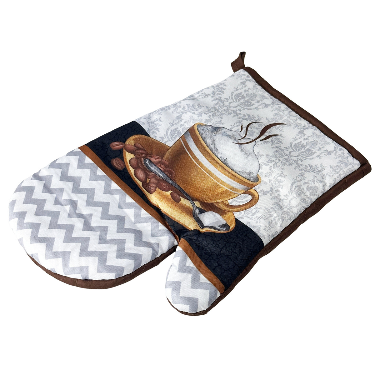Komplet 2 rękawic kuchennych z nadrukowanym motywem, z magnesem. Rękawice chronią przed poparzeniem. Rozmiar rękawic: 16x27 cm. Materiał 100% poliester, wypełnienie z 100% włókniny poliestrowej. Komplet złożony z 2 szt. rękawic (prawa i lewa). Temperatura prania 30°C.