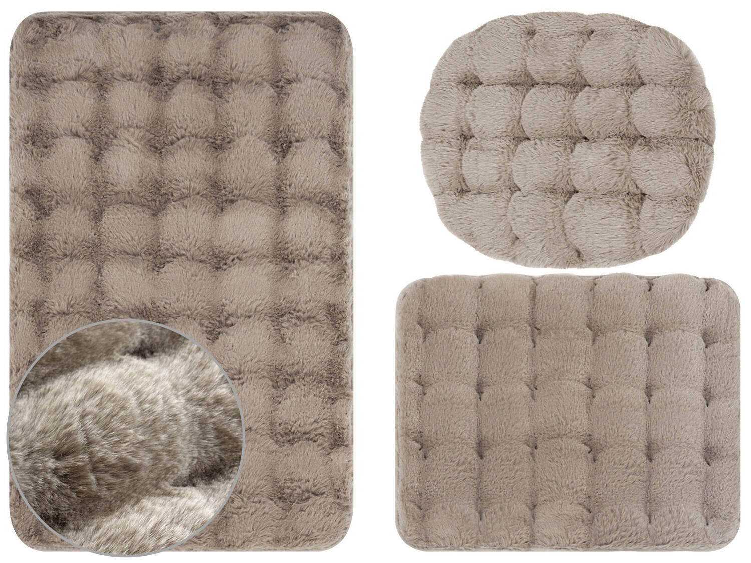 Egyszínű jacquard mintás szőnyegek, puha, hosszú poliészter szálból, csúszásmentes latex alján. Mosási hőmérséklet 30 ° C. 100% poliészter mikroszálas. A függesztett WC-tálakhoz igazodik. Mosási hőmérséklet 30 fok C.