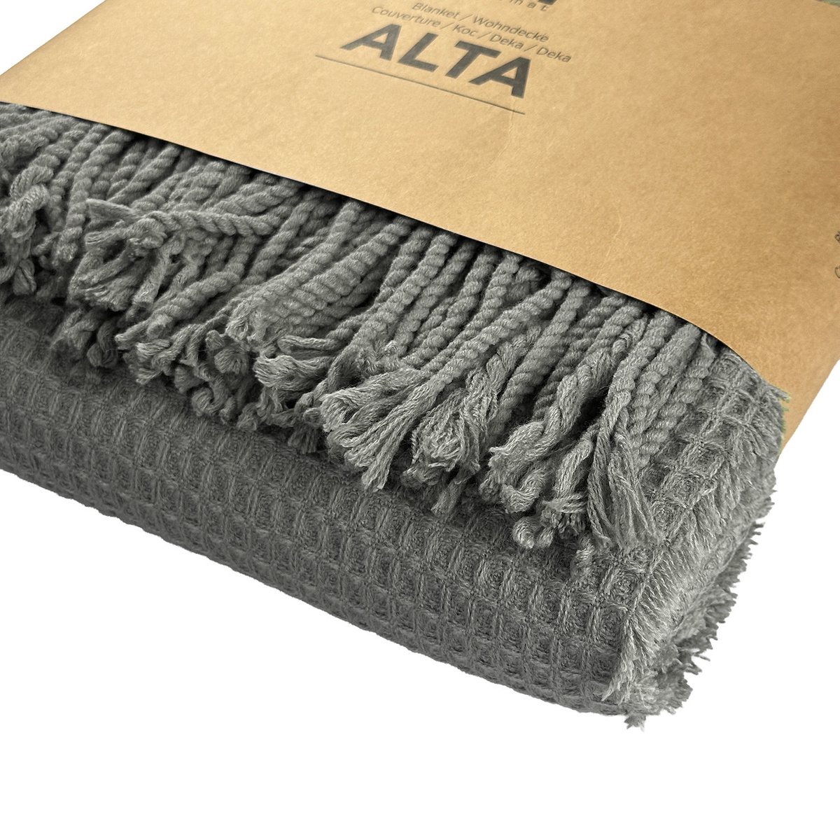 Az Alta pléd tartós akril fonalból készült, könnyen kezelhető és gyűrődésmentes. Jellegzetes gofri textúrája modern és stílusos megjelenést kölcsönöz. A szélén található rojtok elegáns részletként szolgálnak.
