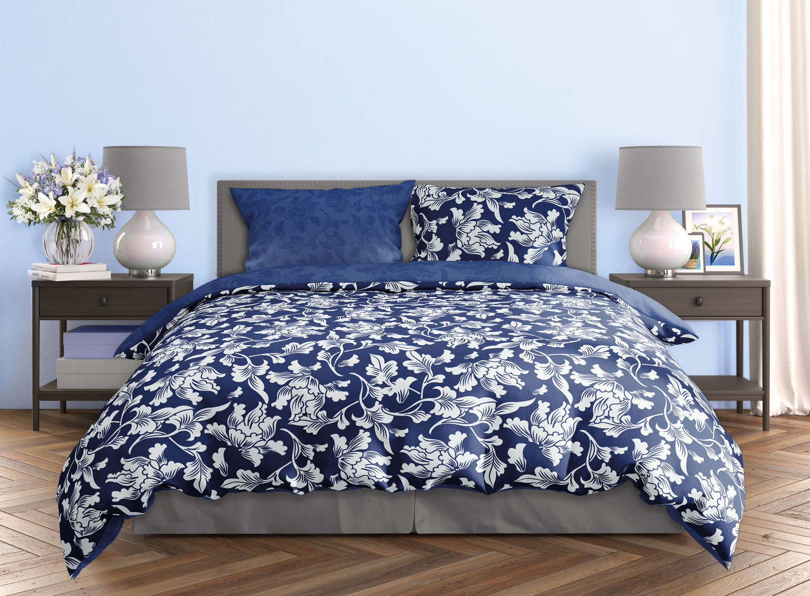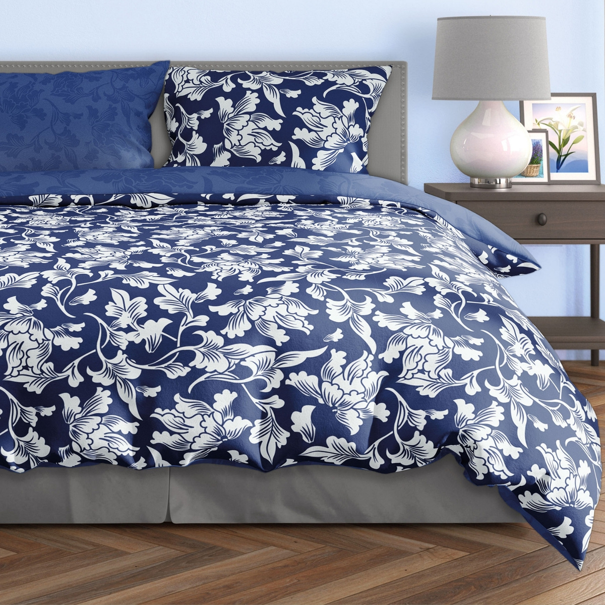 Pamut szatén ágyneműhuzat-garnitúra. A szett tartalmaz egy paplanhuzatot és két párnahuzatot.