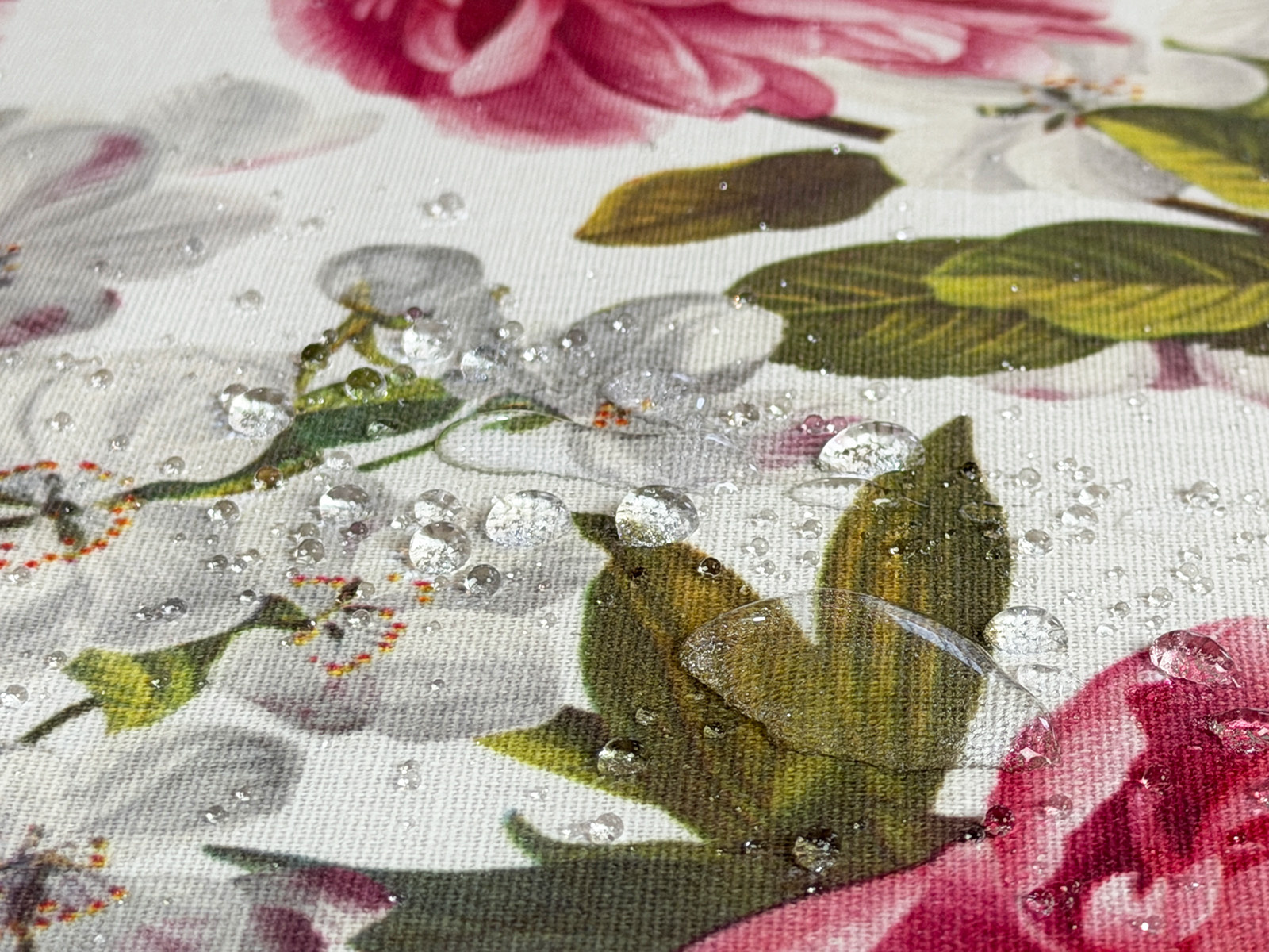 Az anyag vízlepergető bevonattal rendelkezik, így a kiömlött folyadékok nem szívódnak fel azonnal. A digitális, többszínű nyomtatás élénk színeket és modern megjelenést biztosít.